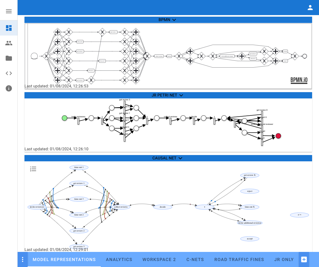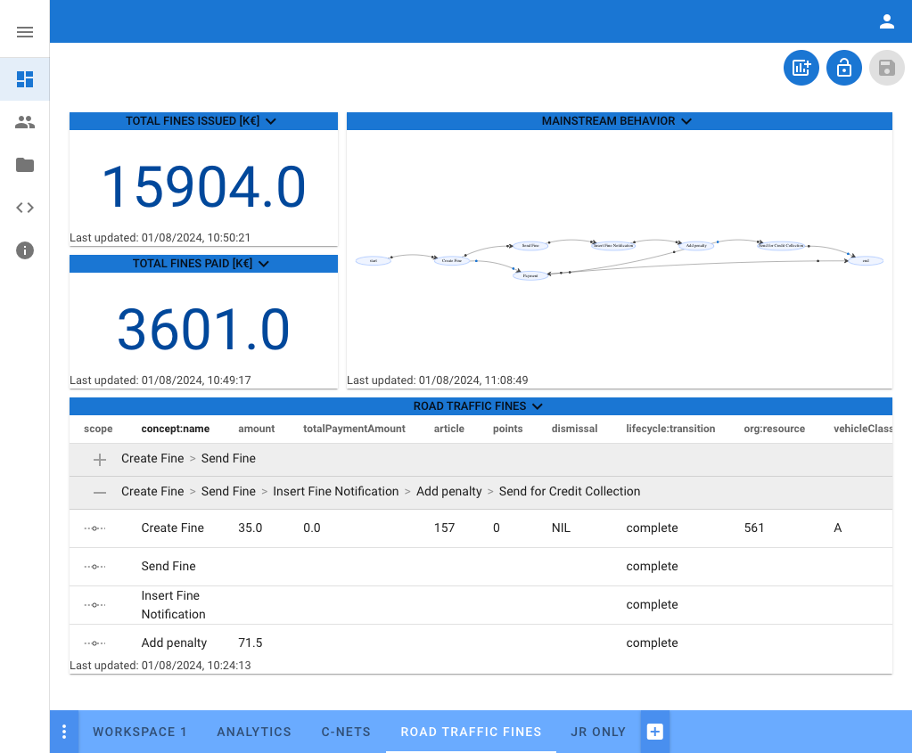 Create dashboards to conveniently view and analyze your business processes from multiple perspectives. Set up components to display Key Performance Indicators (KPIs), graphical models of ongoing processes, and conformance reports. Analyze raw event logs and process them using flexible query language. Identify bottlenecks, unnecessary waiting, and resource waste. Receive notifications about unexpected changes to the observed processes. Share your dashboards with other members of your organization using Access Control Lists (ACL).