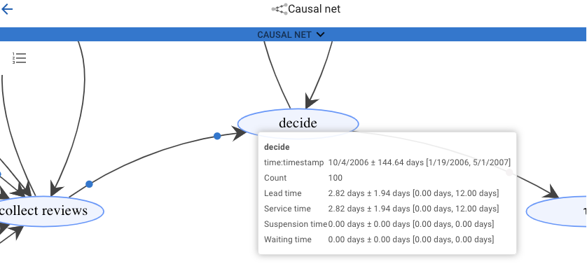 View, analyze, and monitor your business processes using clear graphical models. Choose from convenient representations such as industry-standard Business Process Model and Notation (BPMN), academically-leading Petri nets, or concise Causal nets. Inspect automatically calculated Key Performance Indicators (KPIs) for individual activities and the connections between them. Quickly filter details using sliders for readability.