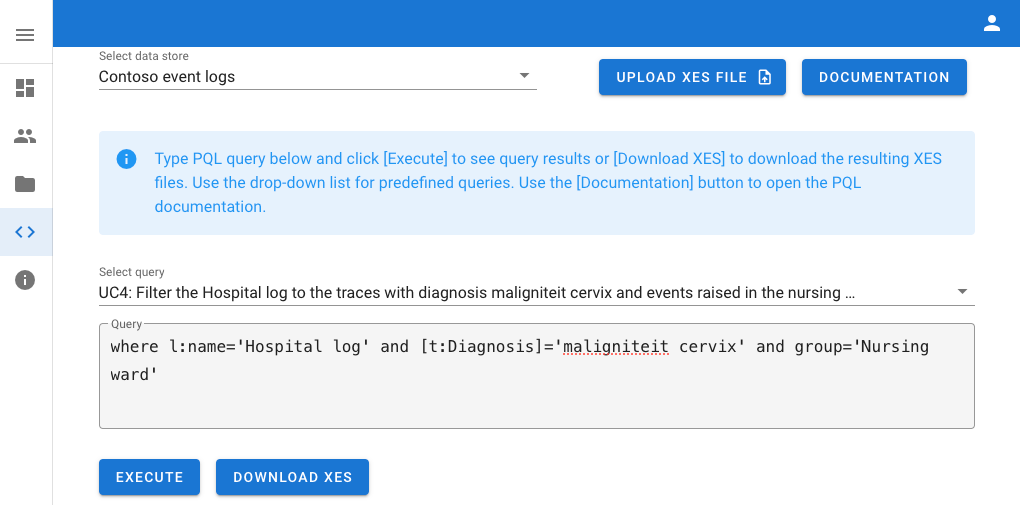 Select, filter, aggregate, and sort events using an SQL-like, yet simplified query language for event logs that every data analyst can immediately understand. Event log preparation, noise filtering, scoping, null filling, trace-to-variant aggregation, and attribute recalculation are readily available at your fingertips. Our query language operates on a data structure compatible with the IEEE 1849-2016 Standard for eXtensible Event Stream (XES), an industry standard in Process Mining.