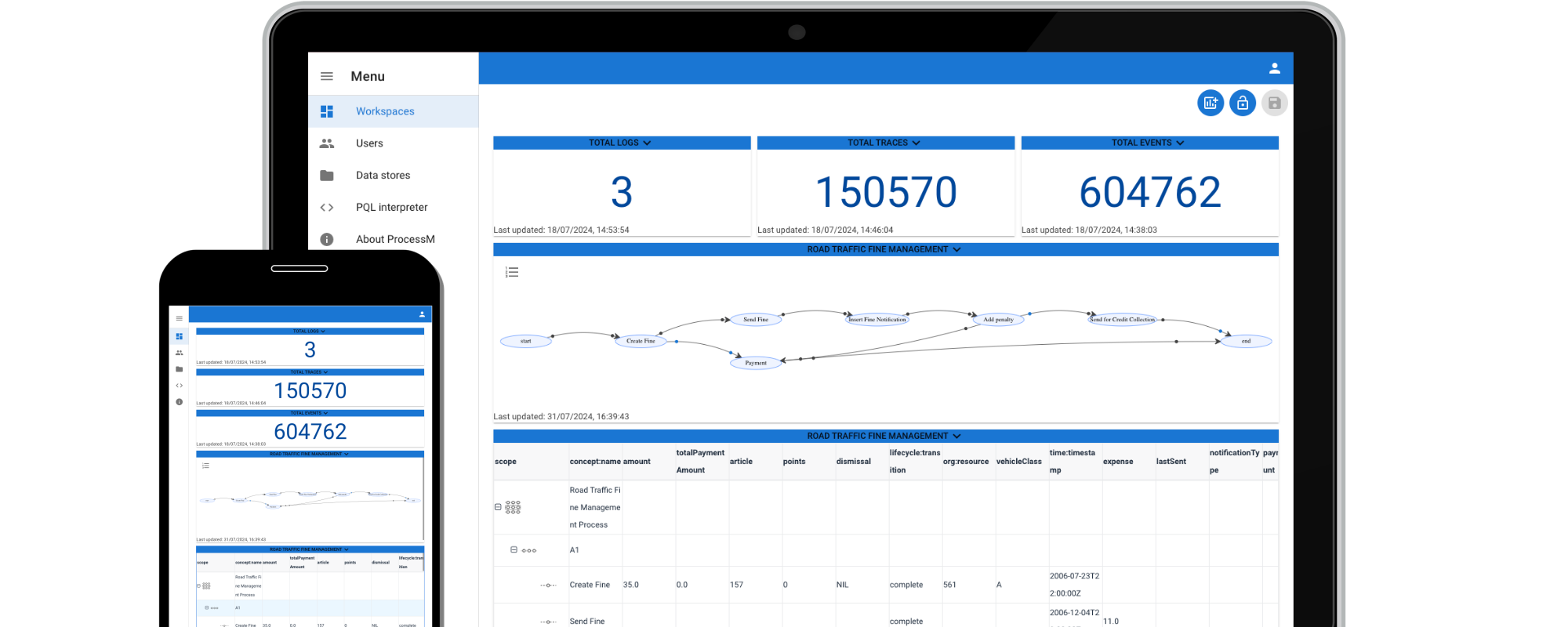 Whether you prefer a desktop computer, laptop, or mobile device, ProcessM is with you. The ProcessM user interface is fully compatible with the latest versions of Chrome, Edge, Firefox, Opera, and Safari on both desktop and mobile systems. The server backend operates on current versions of Windows, Linux, and macOS with Java v17 and TimeScaleDB v2.13+ installed. For the best experience, we recommend using our preconfigured Docker image on Linux.